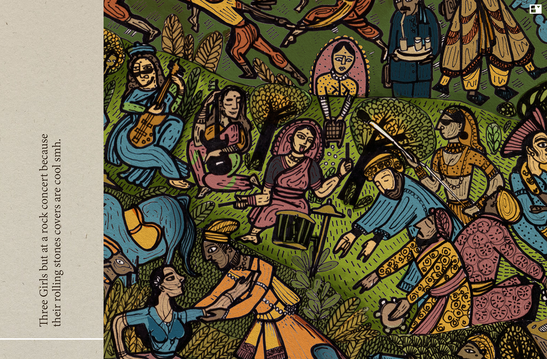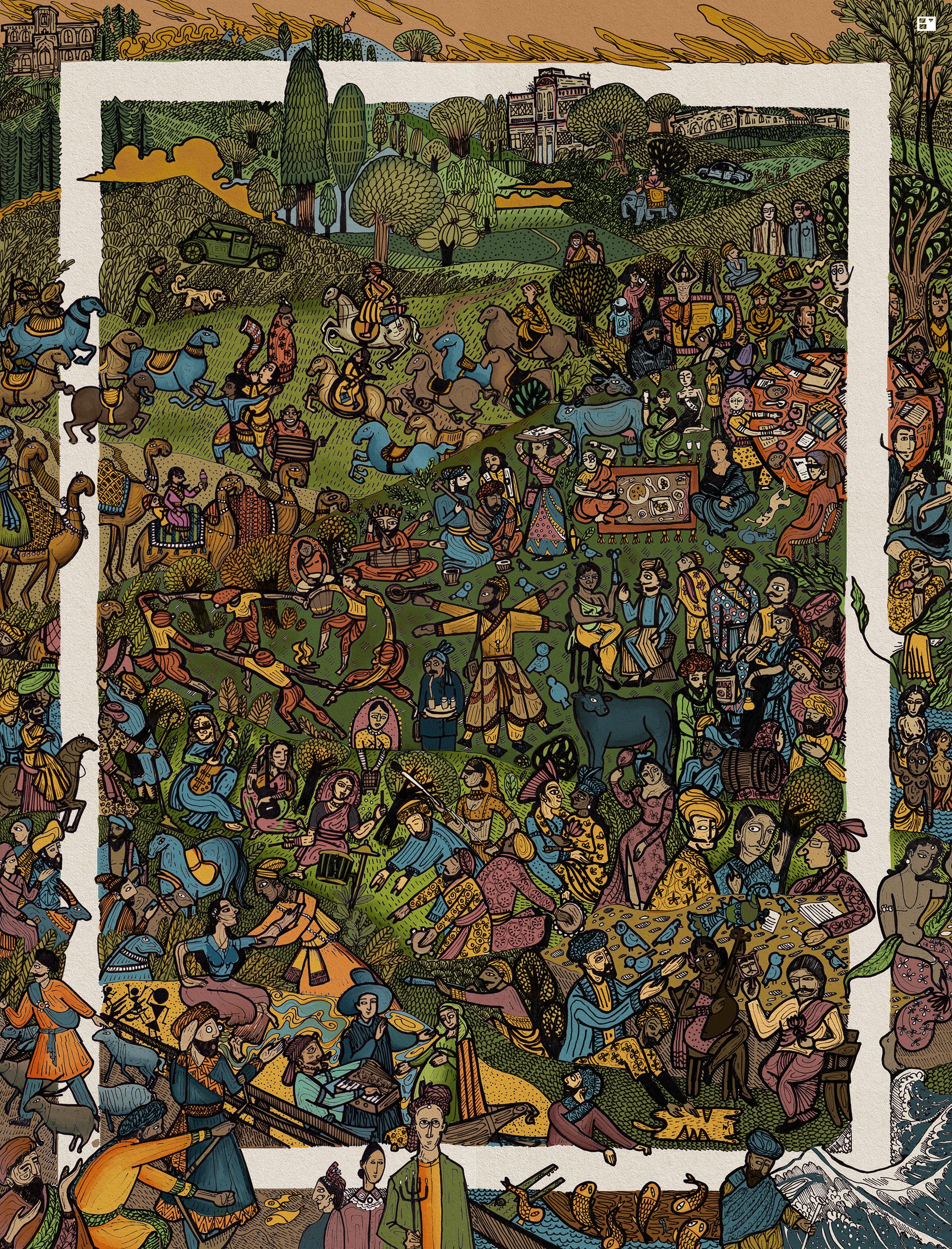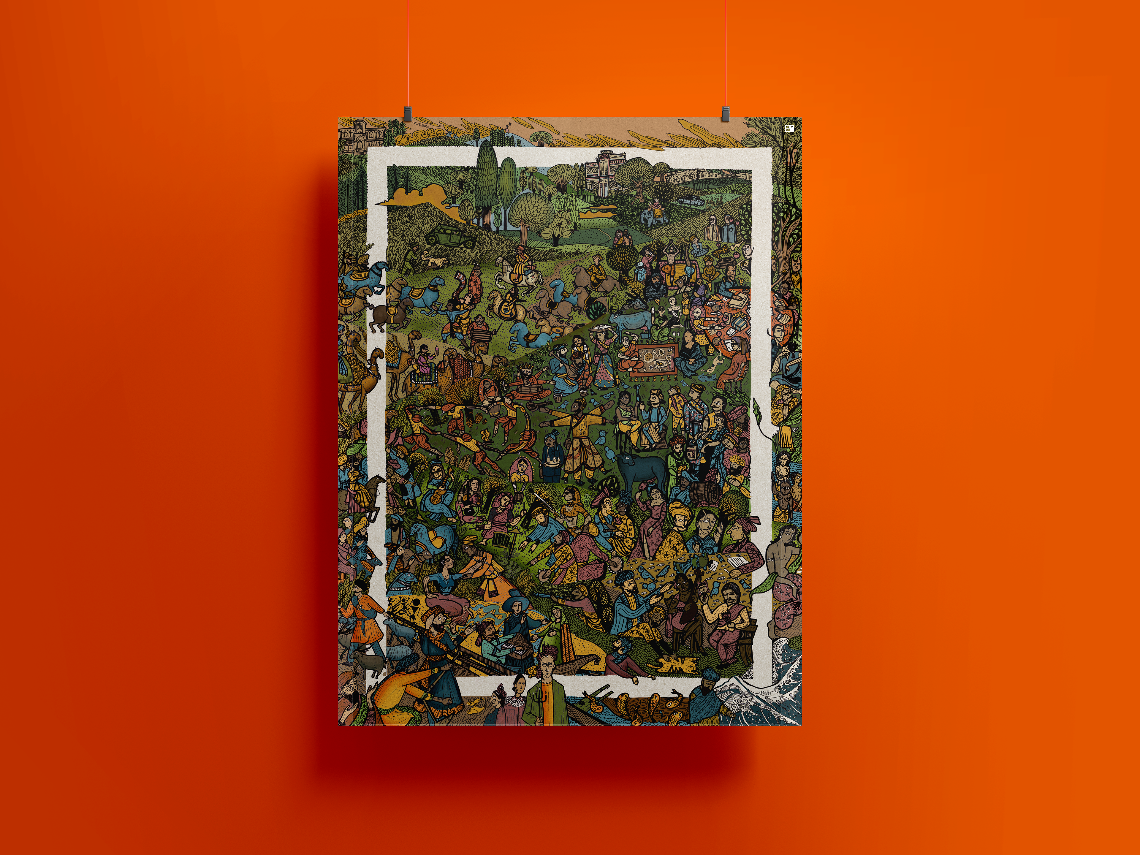 A 2 feet by 3 feet folktale artwork consisting of styles from Kangra art, Garhwal art, Basohli art, Miniature paintings, Kalighat paintings, Madhubani art, Orient, Ft. The West.